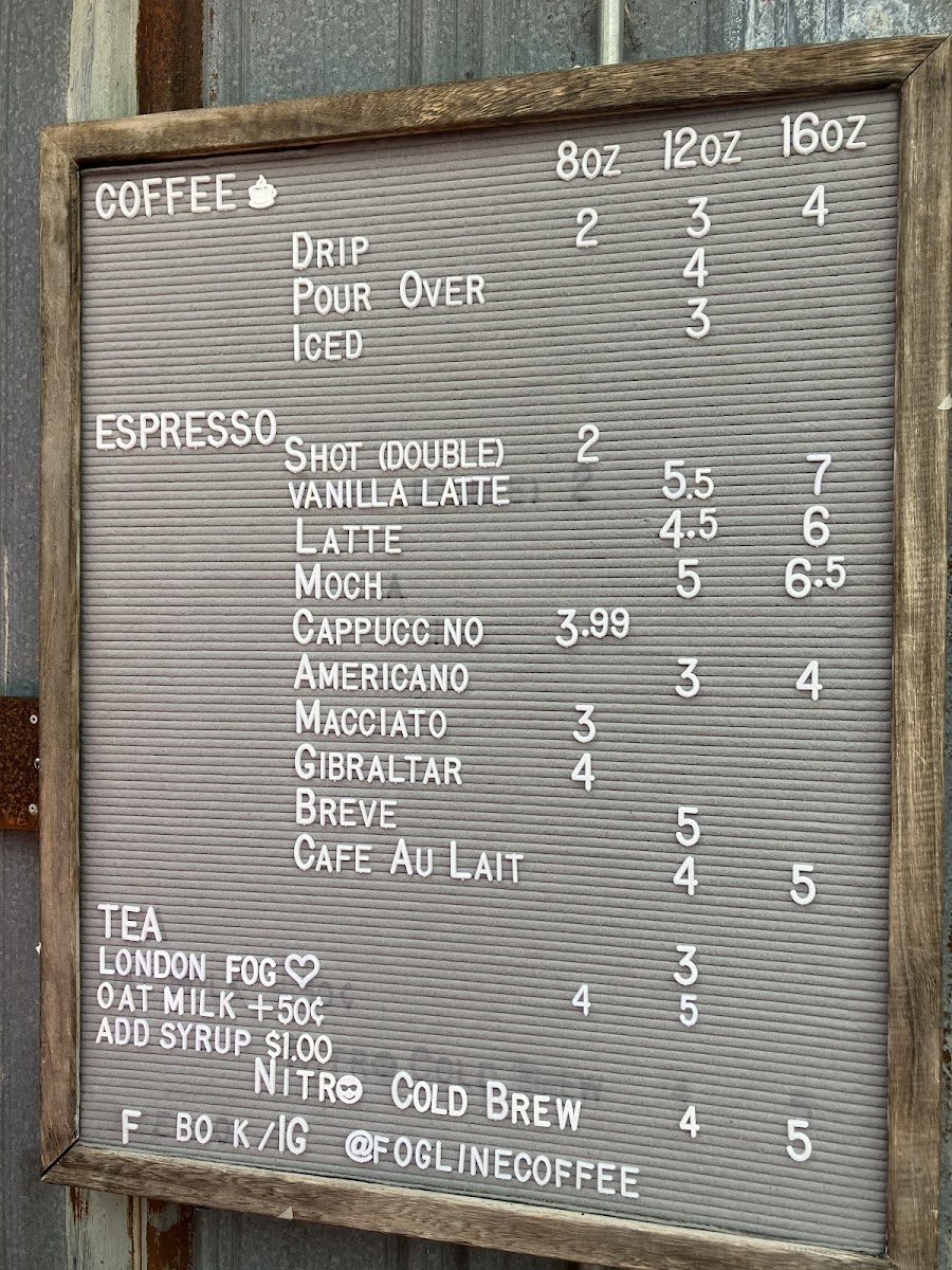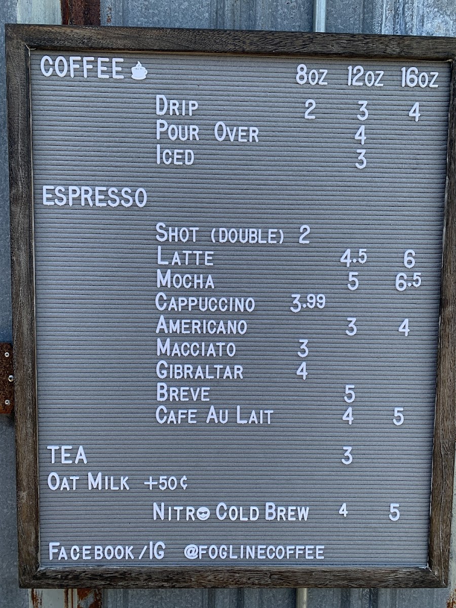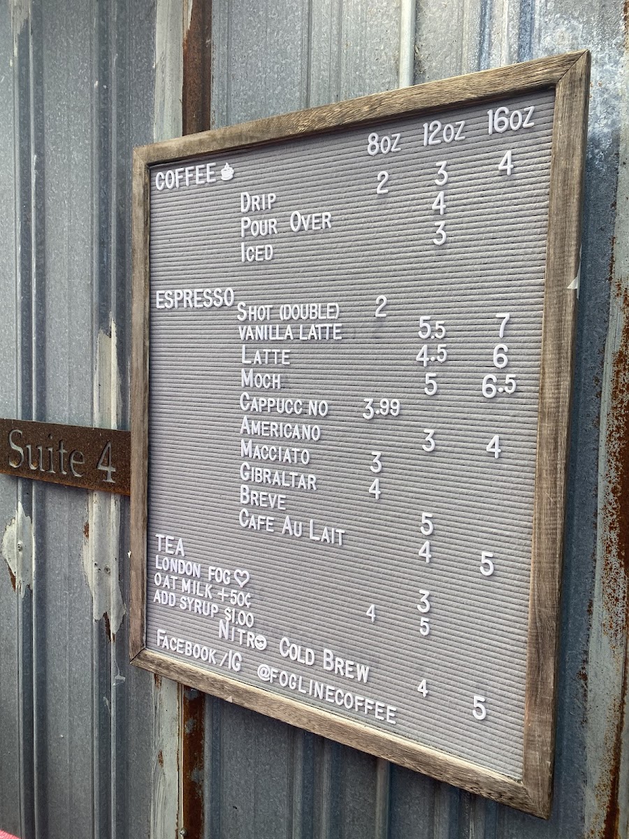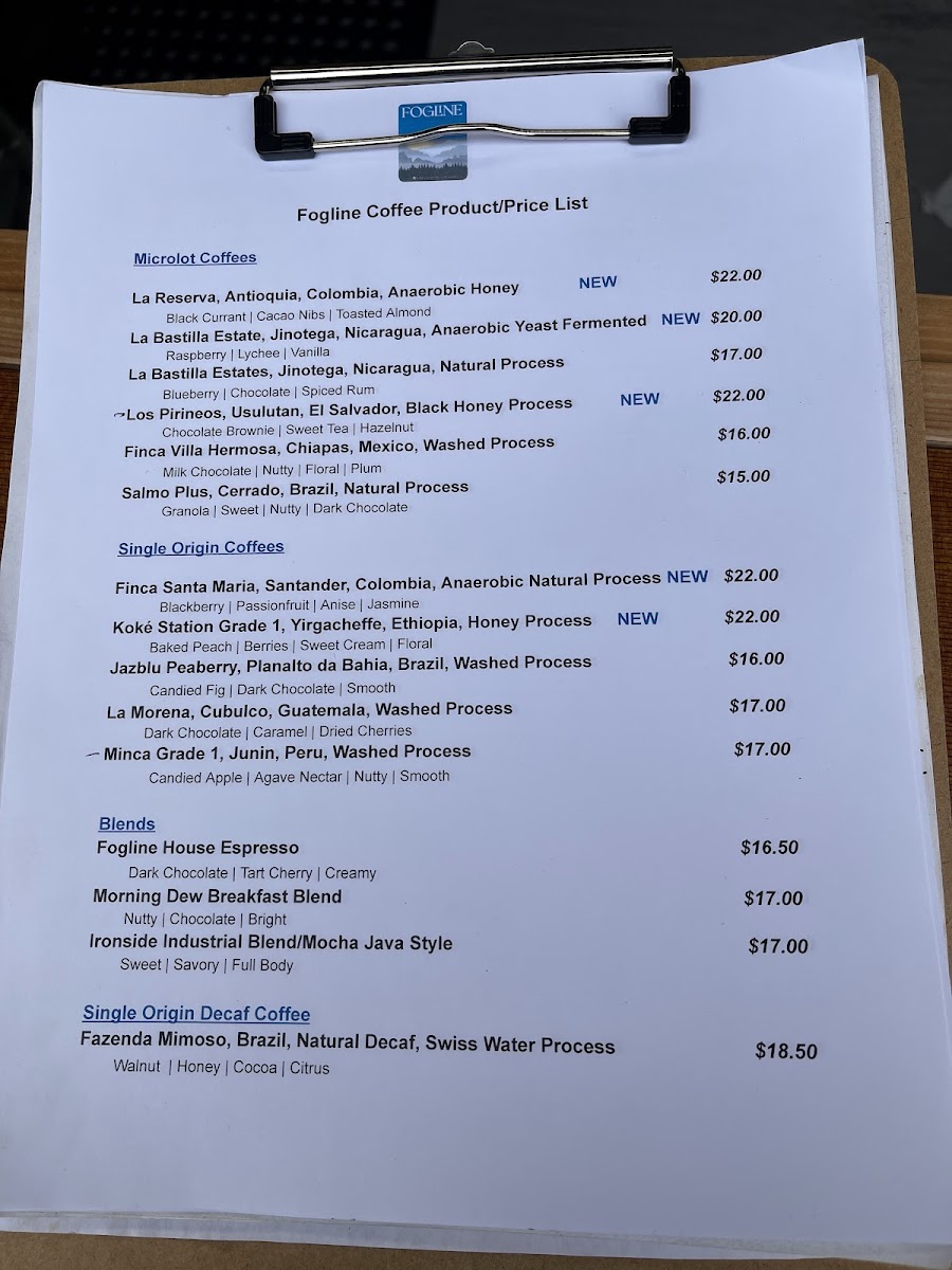 Fogline Coffee offers a carefully curated selection of coffee drinks and microlot offerings, catering to coffee enthusiasts seeking unique flavors and experiences. Their menu features a variety of brewing methods, including Drip and Pour Over for those who enjoy classic brewing. For espresso lovers, options like Shot, Vanilla Latte, LatteMoch, and Cappuccino No deliver rich and smooth flavors. The microlot section includes exceptional beans such as La Reserva from Antioquia, Colombia, with its anaerobic honey process, and La Bastilla Estate from Jinotega, Nicaragua, showcasing both anaerobic yeast fermentation and natural processes. Single origin coffees like Finca Santa Maria from Santander, Colombia, and Koké Station Grade 1 from Yirgacheffe, Ethiopia, are perfect for those who appreciate distinctive tastes from specific regions. The blends are equally impressive, with choices like Fogline House Espresso, Morning Dew Breakfast Blend, and Ironside Industrial Blend/Mocha Java Style, which offer balanced profiles suited for various preferences. For those looking for decaf options, the Fazenda Mimoso from Brazil offers a natural decaf option through the Swiss Water Process. In addition to these, the menu includes a range of classic espresso drinks such as Macchiato, Gibraltar, Americano, and Cappuccino, ensuring a broad appeal to all types of coffee drinkers.